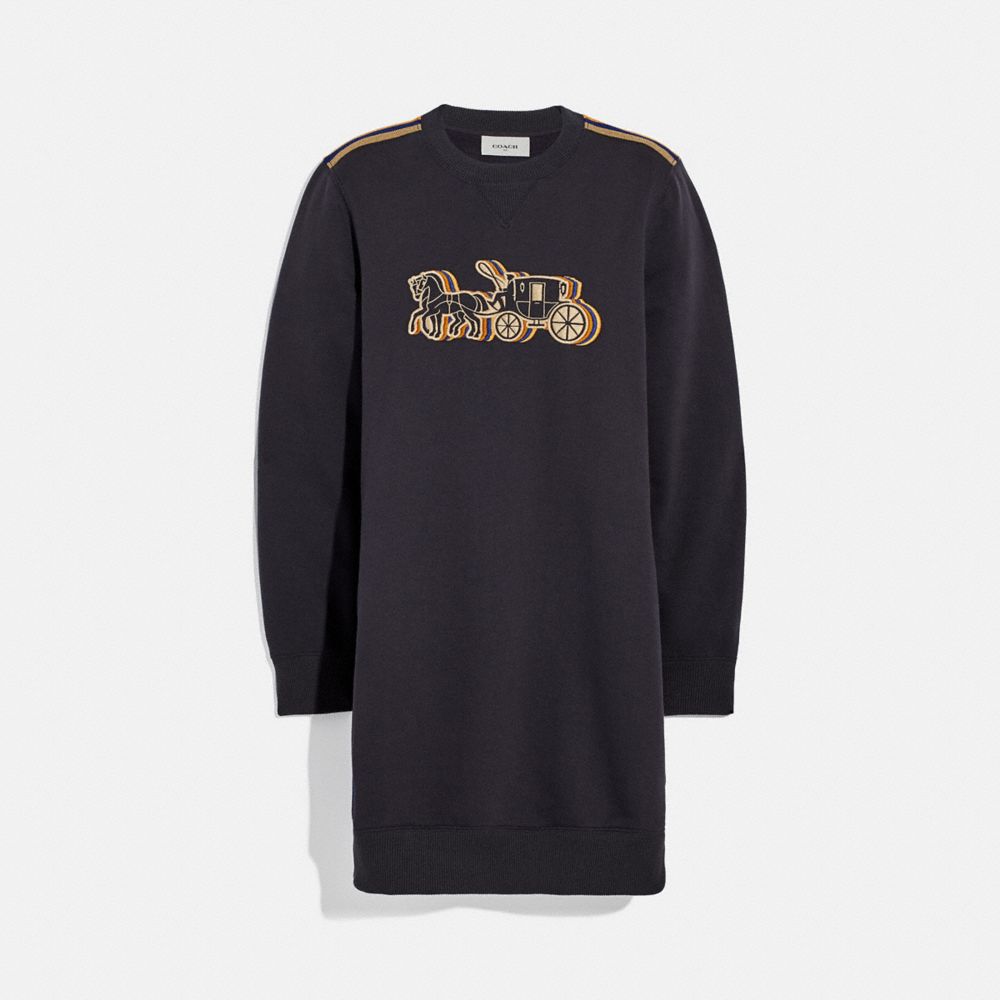 L’incontournable modèle sportif revisité prend la forme d’une robe pull surdimensionnée brodée de notre motif cheval et calèche arc-en-ciel en relief. Ce modèle à col ras du cou est confectionné dans un mélange de coton doux et agrémenté de nos rayures universitaires d’inspiration sportive.