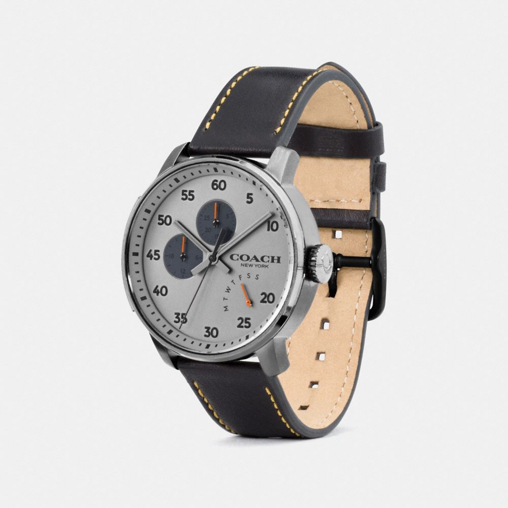 A traditional design meets high-tech functionality on the Bleecker watch. It features three subdials that display hours, minutes and the day of the week.