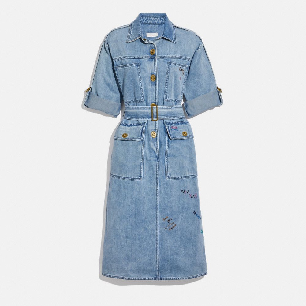 Redéfinissant le blues, cette robe en denim lavé compte notre quincaillerie à verrou tournant iconique pour une touche héritage. Brodée de façon des plus colorées avec des symboles enjoués et des dictons, cette silhouette ceinturée est finie avec un col en pointe classique, des poches avant et cargo et des manches à poignet à patte que vous pouvez rouler ou non.