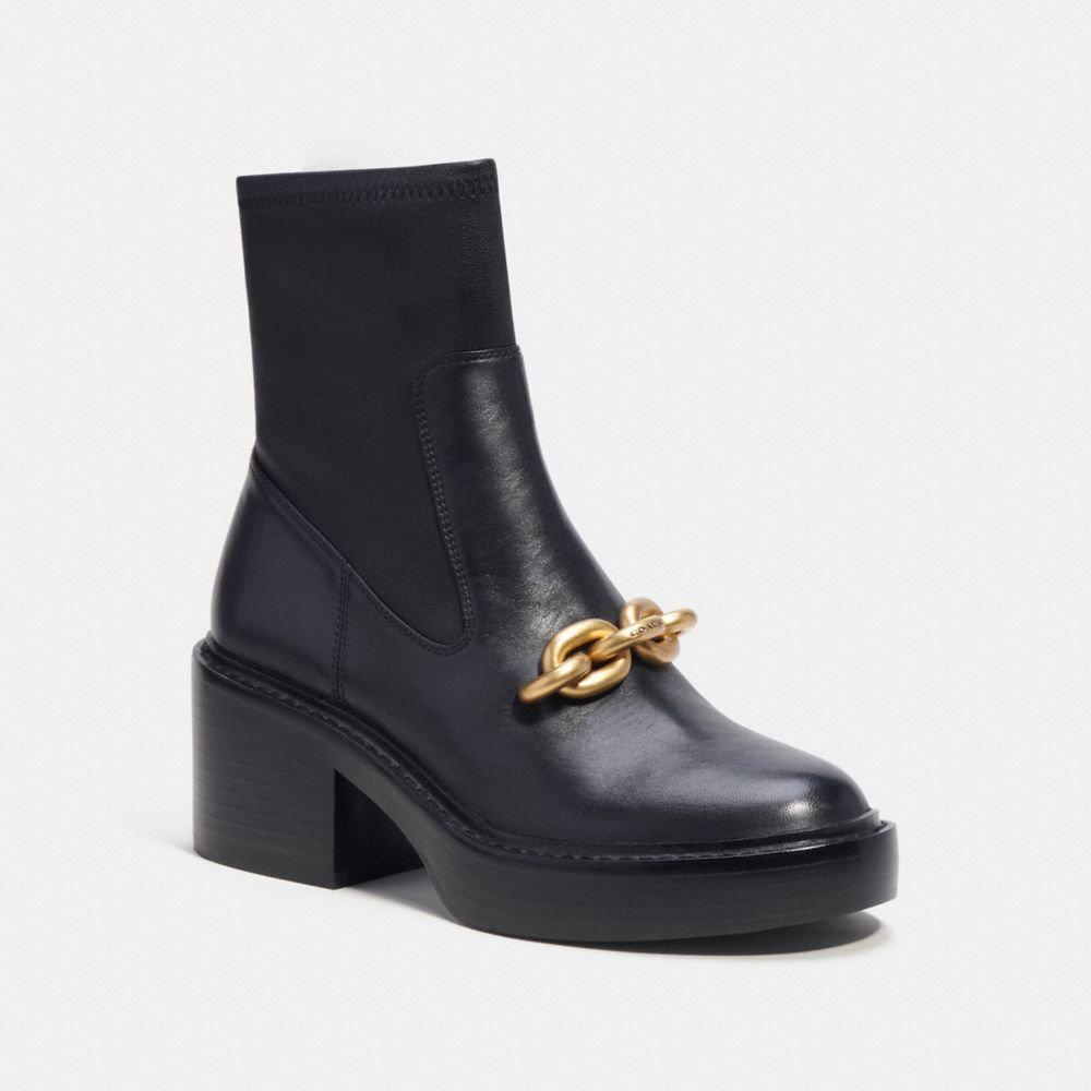 Agrémentée d’un maillon de chaîne épais étincelant pour plus de dimension, notre bottine Kenna est confectionnée en cuir extensible pour un ajustement sur mesure. Ce modèle facile à enfiler est complété par un talon carré conçu pour marcher et une semelle en caoutchouc pour une bonne adhérence.