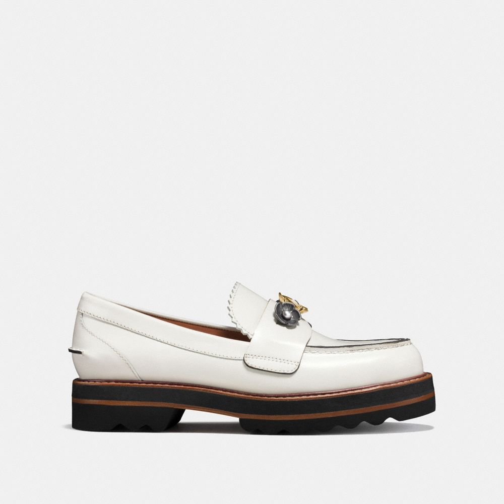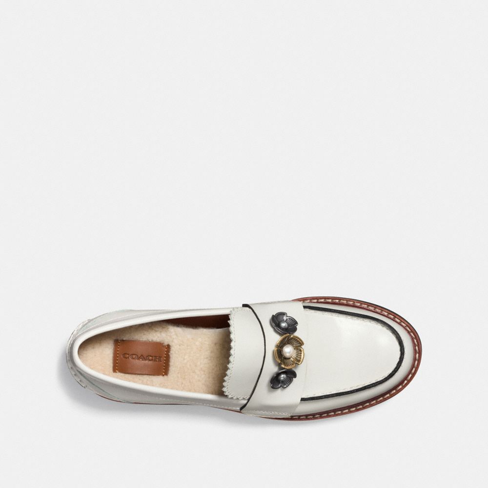 Nostalgic and modern, the Lenox loafer is customized with signature Tea Rose appliqué and pearly cabochons. Crafted of smooth leather with interchangeable shearling and leather insoles, the retro silhouette is finished with a dramatic platform sole.
