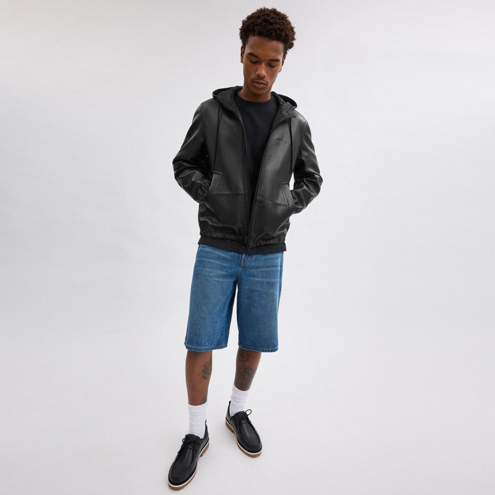 Revisitant le sweat à capuche classique, cette veste réversible est confectionnée en cuir ultra doux d’un côté et en nylon léger exclusif de l’autre. Ce modèle ample possède une fermeture éclair sur le devant, des poignets et une base élastiqués pour bloquer le froid, et des grandes poches zippées.