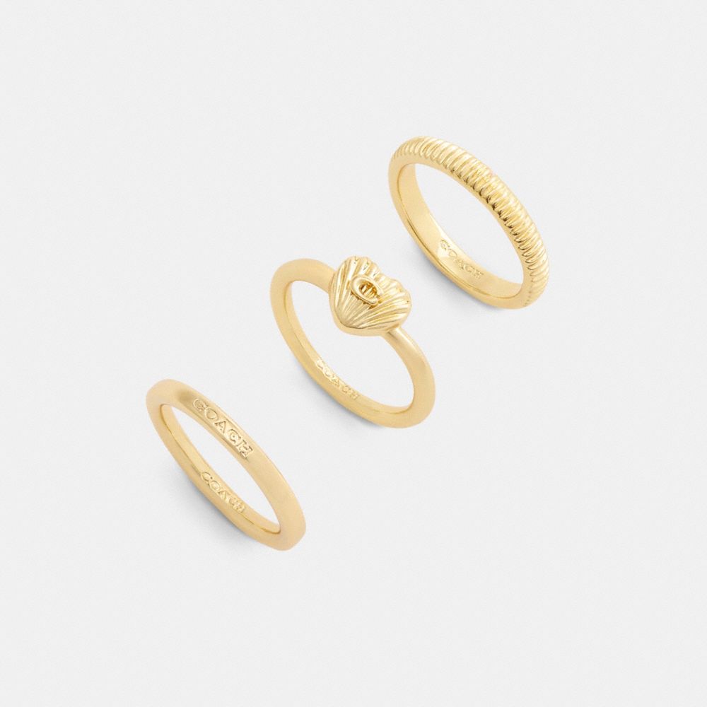 A lot to love. This set features a trio of rings—one ribbed textured band, one slim band etched with our name and a ribbed textured heart ring accented with our Signature. Wear together or separately.
