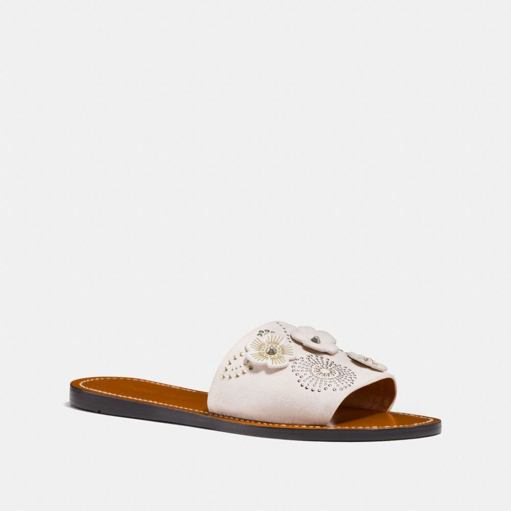Ces sabots au style décontracté affichent des clous rose thé, une nouvelle version de notre motif exclusif revisité avec divers matériaux et des clous appliqués à la main. Ils sont confectionnés en daim et se marieront à la perfection avec un jean ou avec une robe.