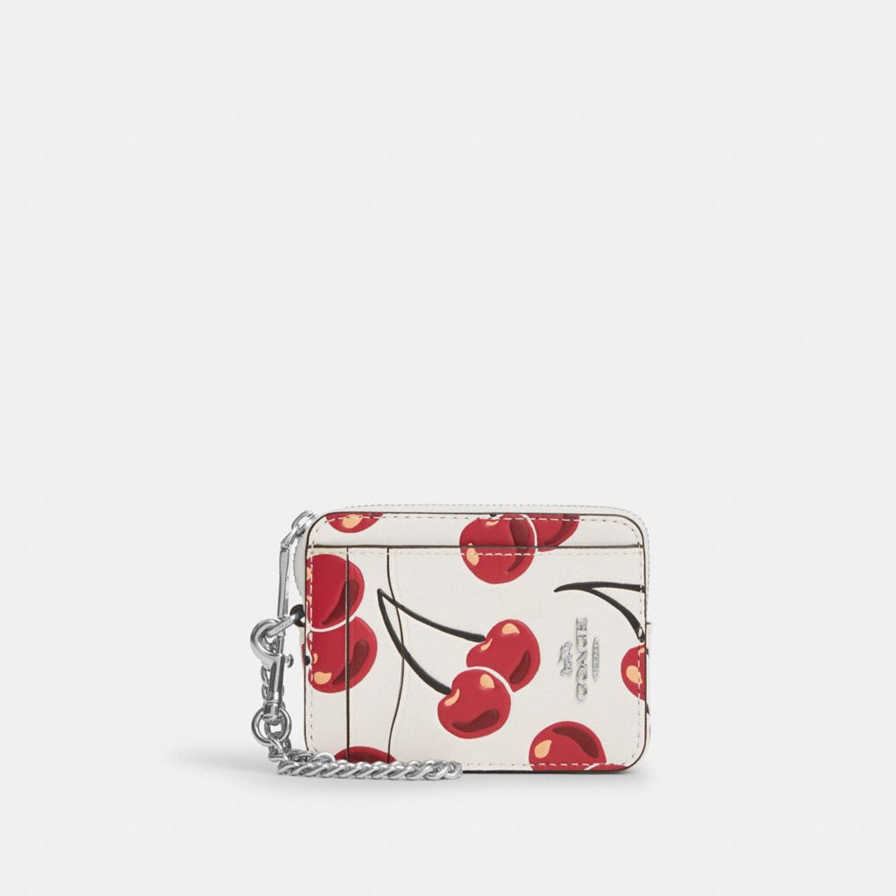 An ultra-compact essential, this Zip Card Case is crafted of smooth and novelty leather. It's the perfect size to slip into your pocket or bag, holding all your essential cards and cash with ease. The zip closure keeps everything secure, while the convenient slots organize your cards. Plus, it has a handy window to easily display your identification. To complete the look of this cherry zip card case, a chain wrist strap adds a touch of shine. It's the ultimate, lightweight companion for keeping your necessities close at hand.